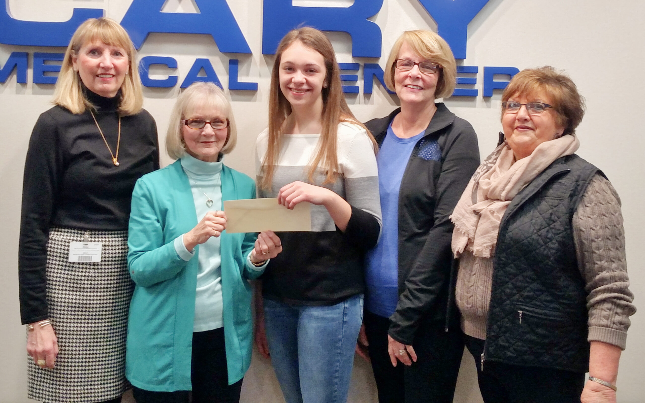 Kaitlyn Nadeau of Caribou, center, recently received a $1,000 scholarship from the Cary Medical Center Ladies Auxiliary. The auxiliary awards the scholarship annually to a student entering a medical-related field. Nadeau is a 2017 Caribou High School graduate and a freshman at the University of Maine, Orono, enrolled in the pre-med program. She is the daughter of Holly Nadeau of Caribou and Gary Nadeau of Caribou. With her are, from left, Cary Ladies Auxiliary Scholarship Committee Members, (left to right), Mary Harrigan, April Caron, Barb Collins and Betty McNeal. (Courtesy of Cary Medical Center)