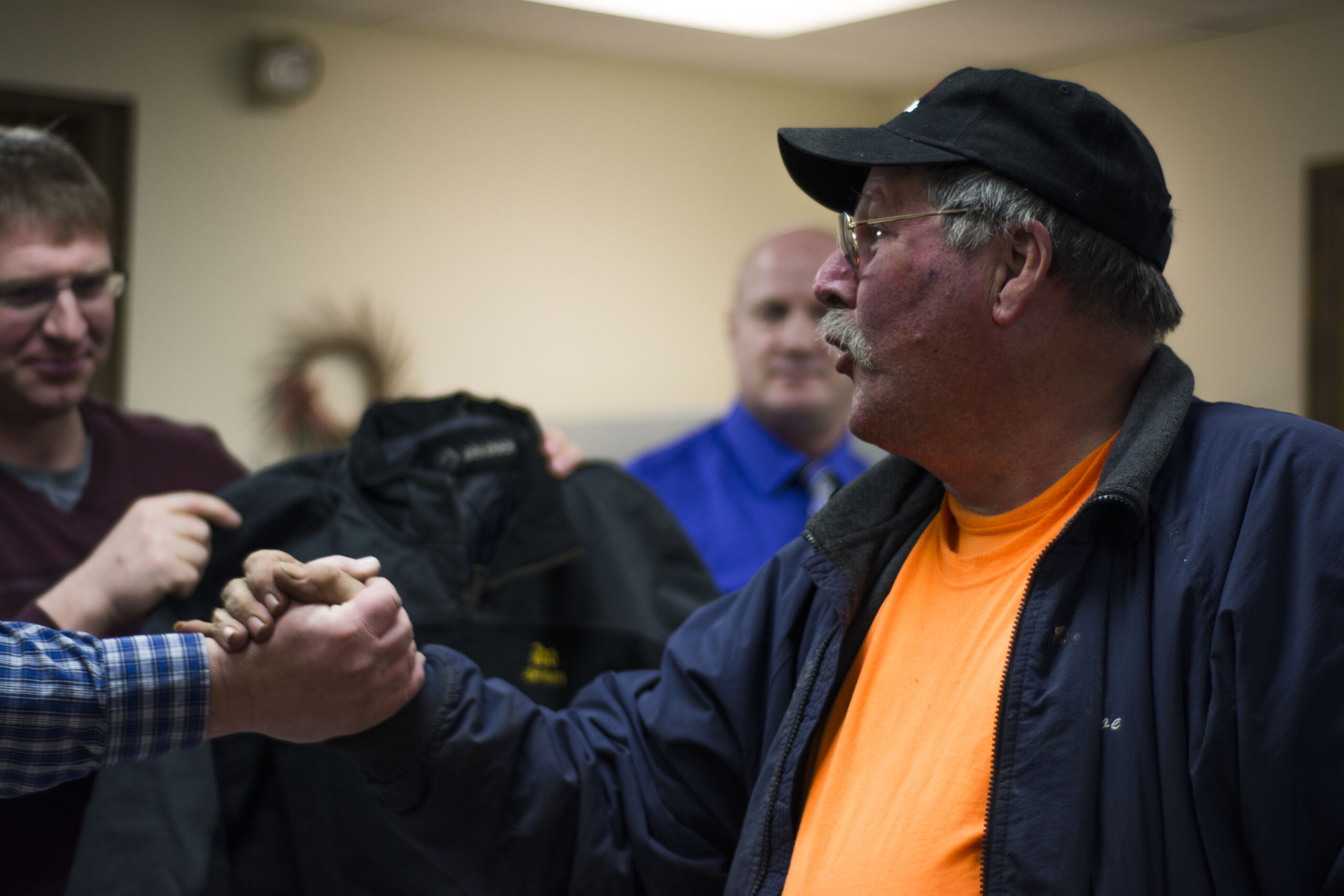 - Woodland Selectman William Barnum holds up a custom jacket presented on Feb. 20 to public works employee Joe McEwen, who has served the town for more than 45 years. (Christopher Bouchard)