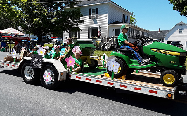The “Little Blossoms” ride on a John Deere-themed float during the Maine Potato Blossom Parade this past Saturday.