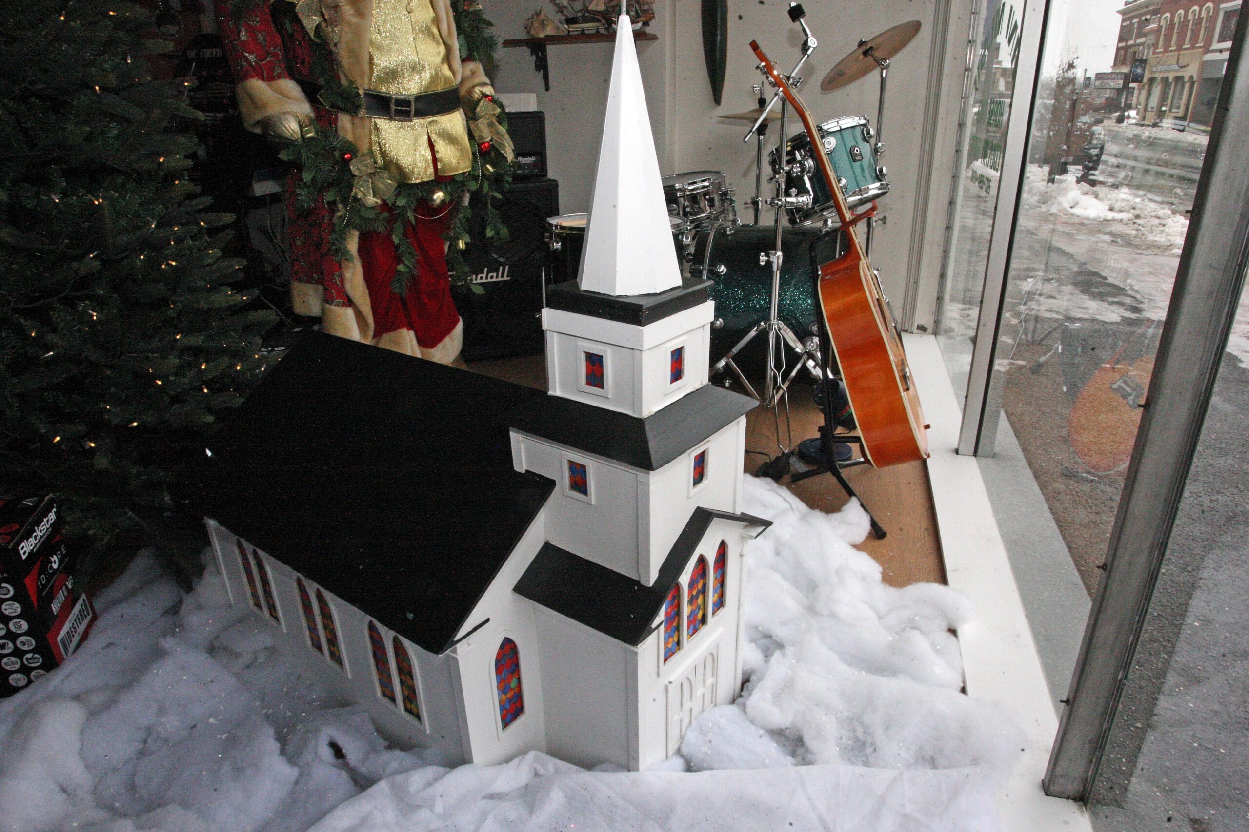 Lovely said Ken Clukey, who does repairs on guitars for her business, refurbished the church for display in her window.