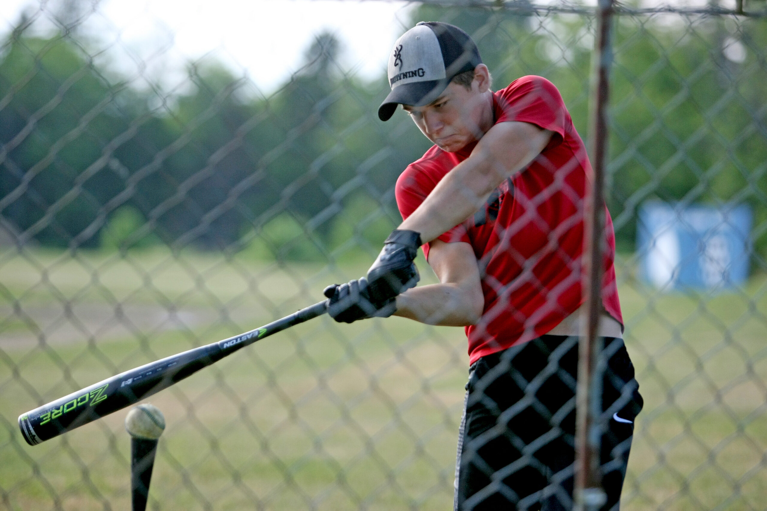 Drew Duttweiler takes a swing during batting practice June 24 in Hodgdon. Duttweiler is one of a dozen athletes in southern Aroostook County who is playing baseball this summer. (Joseph Cyr)
